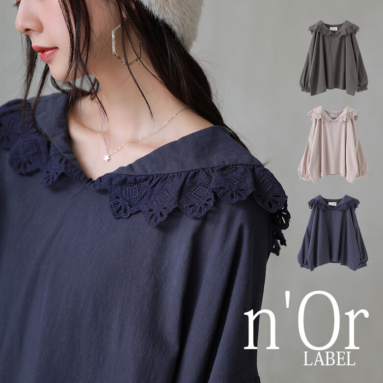 レース付きの襟が可愛いビッグカラーのトップスはいかがでしょうか。同色のレースですので落ち着いて見えます。派手過ぎない綺麗なカラーデザインですのでお洋服にも合わせやすいです。フェミニンでエレガントですのでおすすめです。