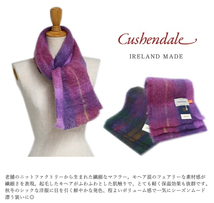 アイルランド製のモヘアマフラーです。暖かみのあるチェック柄に優しい風合いがさらに洗練されたコーディネートのアクセントになります。チクチクしないので首に巻くのはもちろん、少し大きめサイズなので肩掛けストールとしてもお使いいただけます。程よくボリュームがあるので、厚着をしたコートの上に羽織ってもバランスが取れておしゃれな印象に。鮮やかで綺麗な発色が目を引きます。