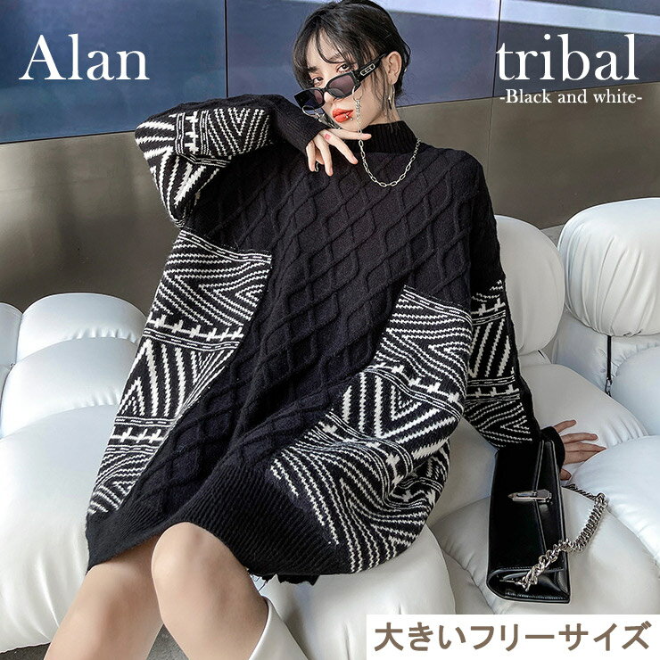 レディース用のジャガード柄のニットチュニックでゆったりシルエットのオーバーサイズで落ち着きのある雰囲気で着こなしやすいです。