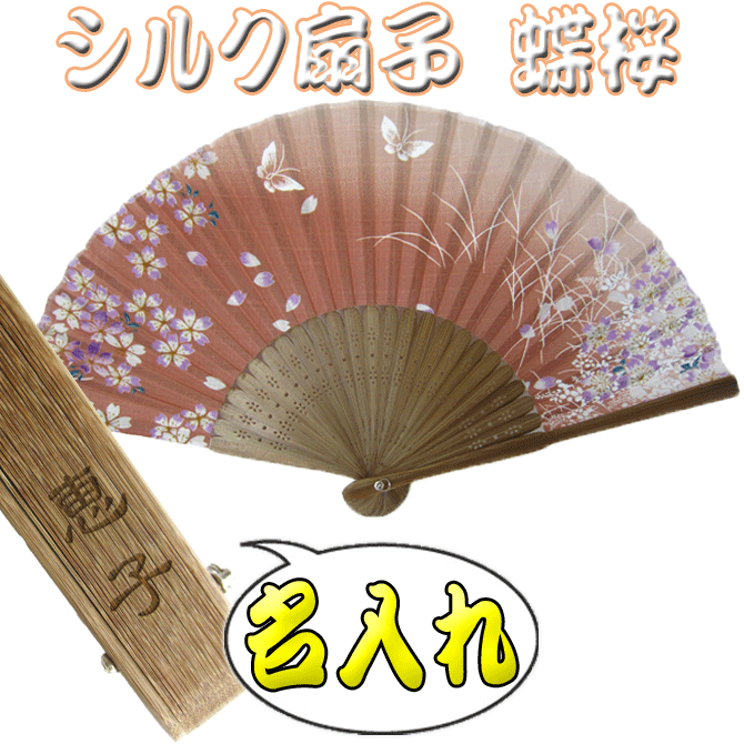 桜と蝶柄の優しいピンク色のシルク扇子が和装にも洋装にも合うとおもいます。軽いので携帯にも便利で、閉じた時に持ち手部分に名入れをしてもらえます。プラス850円で差し袋もつけられるので予算内だと思うのでおすすめします。