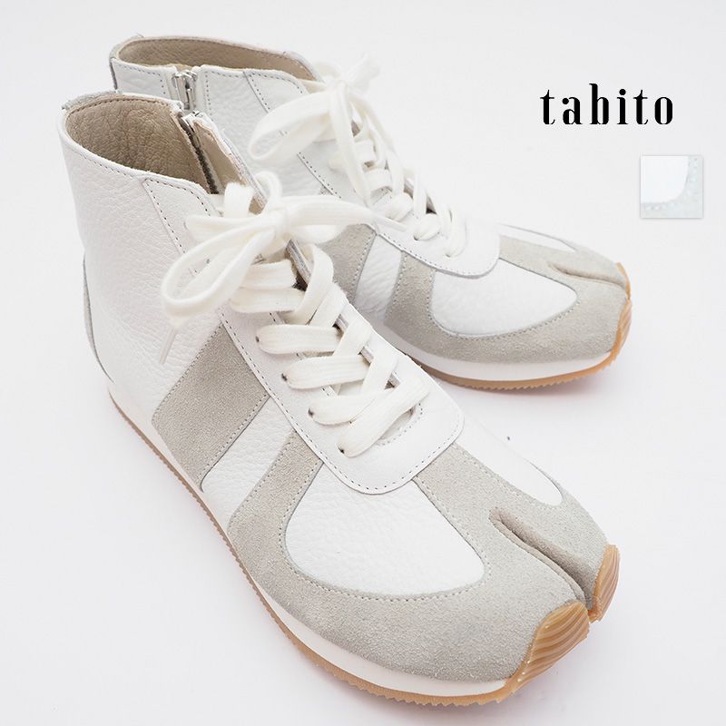 どんなスタイルにも合わせやすいホワイト地のtabitoのハイカットジップ足袋スニーカーです。アッパー部にはレザーも使用されていてお洒落だと思います。