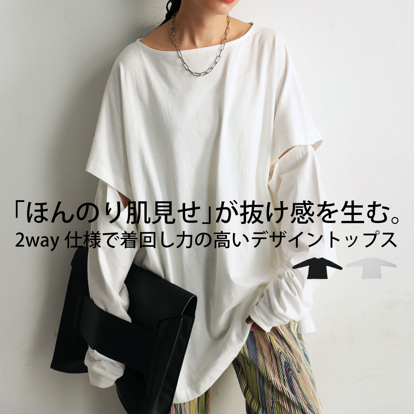 モノトーンの色味でオンオフともに着用しやすい、アンティカの2wayカットソーはいかがでしょうか。少し透け感があり軽いテイストなのも良いですね。綿素材でサラッとした着心地なのも、嬉しいポイントです。