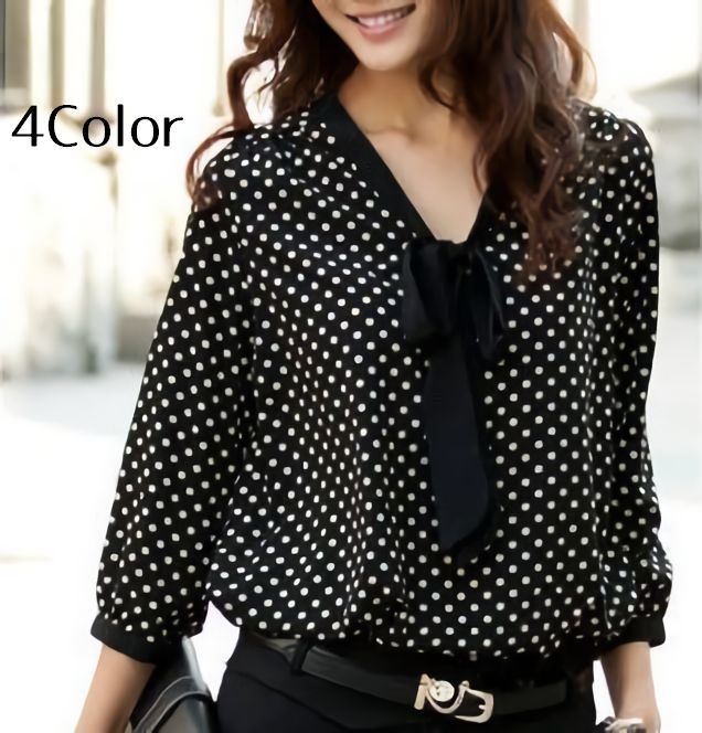 大人っぽい細かいドットがらのボウタイ付きブラウス。今年っぽいふんわりした感じがいいですね