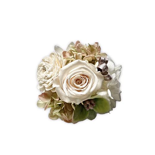 バラと紫陽花のブリザーブドフラワーが使われているコサージュはいかがですか。サイズは幅約8センチです。