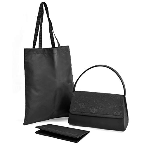 冠婚葬祭で使えるフォーマルバッグ、袱紗、サブバッグの3点セットです。メインバッグのフラップには高級感のあるジャガードデザインを、本体生地には光沢を抑えたリッチなブラック生地していて高級感があります。収納力もある、使いやすい台形フォルムで、永く使える定番セットです。