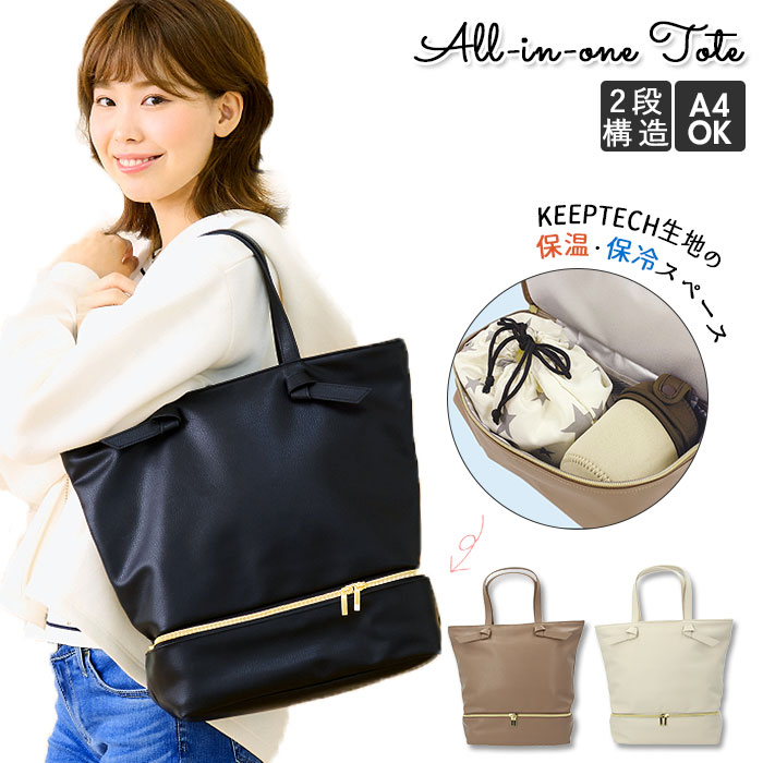 お弁当を持ち歩くのに便利な保冷仕様のスペースが独立して付いているトートバッグです。上部のメインスペースにはA4サイズが入りますので通勤にピッタリだと思い選びました。素材はフェイクレザーで、上段と下段を仕切るゴールドのファスナーがアクセントになり実用も兼ねています。食べ終えて空になったお弁当箱をメインスペースに入れてしまえば、買物した生鮮食品を下段に入れるという使い方も出来て便利そうです。