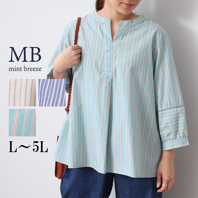ストライプ柄がお洒落なミントブリーズのシャツです。袖が途中から横のストライプになっているのもさりげなくて素敵です。