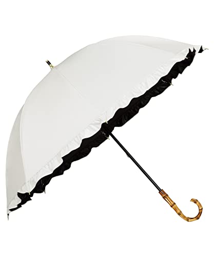 バンブーの持ち手がお洒落な縁がフリルのエレガントな日傘です。完全遮光でUPF50+でしっかり日よけができるのでおすすめします。