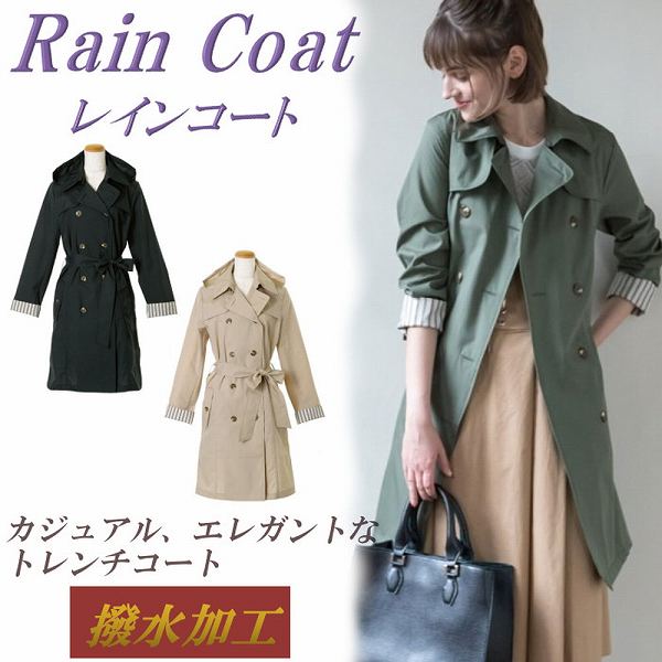 カラーが4色のロング丈のレインコートです。撥水加工が施されて、シルエットが美しいトレンチコートデザインで、大人コーディネートでエレガントに着用出来るので、オススメです。