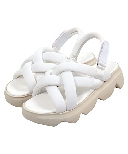 ダブルのクロスデザインに凸凹の厚底というこちらのデザインはいかがでしょう?トレンディなぷっくりしたフォルムが可愛く、厚底と良く似合っていますね。踵はマジックテープ仕様で着脱楽チン、サイズの微調整も効くのでおススメです。