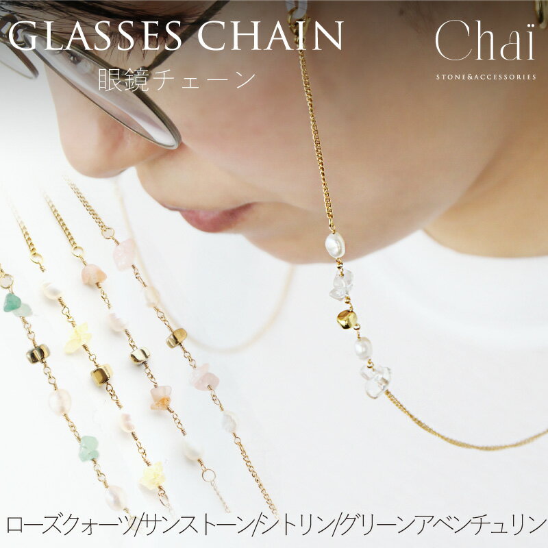 淡水パールと天然石のグラスコードはいかがですか。パールやストーンが左右6個ずつ並んだ上品で可愛いデザインです。天然石は、水晶・サンストーン・シトリン・グリーンアベンチュリンから選ぶことができますよ。
