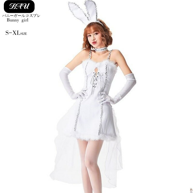 ミニスカートだけど、ハイレグではない、オーガンジーのスカートがついたお上品なバニーガールの衣装です。白なので顔映りよくインスタ映えすると思います。