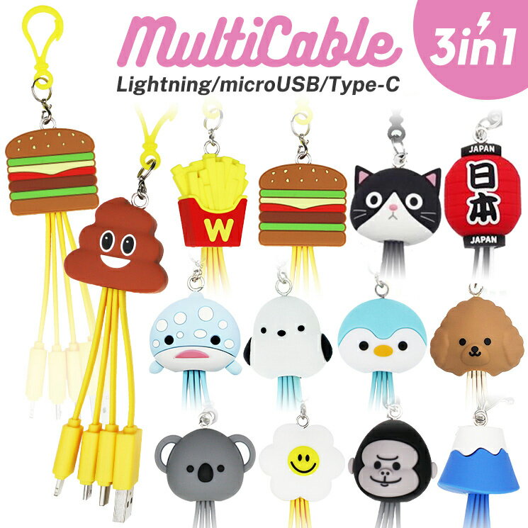 ポップでかわいいチャームがついた充電ケーブル。動物からウケ狙いのものまでラインナップされているので、好きなデザインが見付かるはず。3in1で複数同時に充電することもできます。