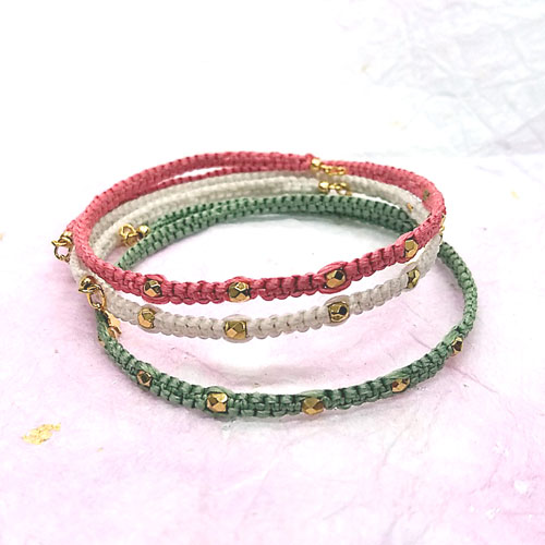 形状記憶するワイヤーの周りに絹糸を編んでいくブレスレットは、ビーズのアクセサリーよりは少し難易度が高いですが、やりがいがありますよ。絹糸の肌触りが気持ち良いです。