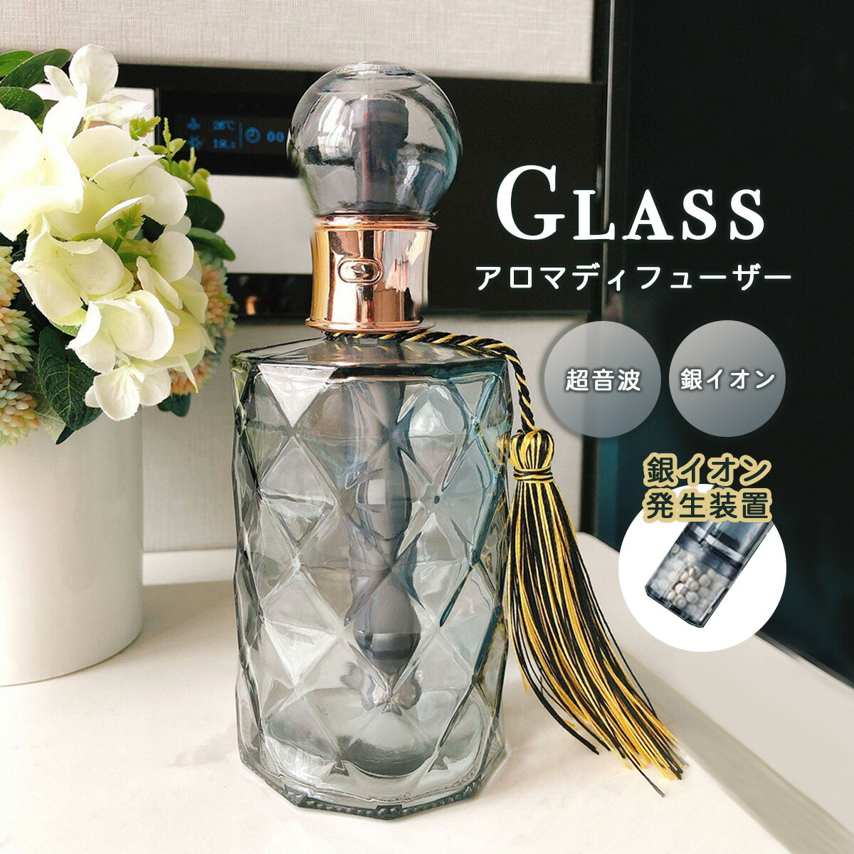 どんなタイプの部屋にも合いやすい上品でクラシカルな美しいガラスの小瓶デザインのアロマディフューザーをおすすめします。