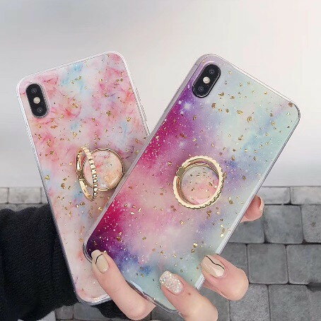 こちらのシリコンケースはいかがでしょうか。綺麗なグラデーションのマーブル柄にキラキラのラメが可愛いです。スマホリング付きで落下防止にもなって良いですね。