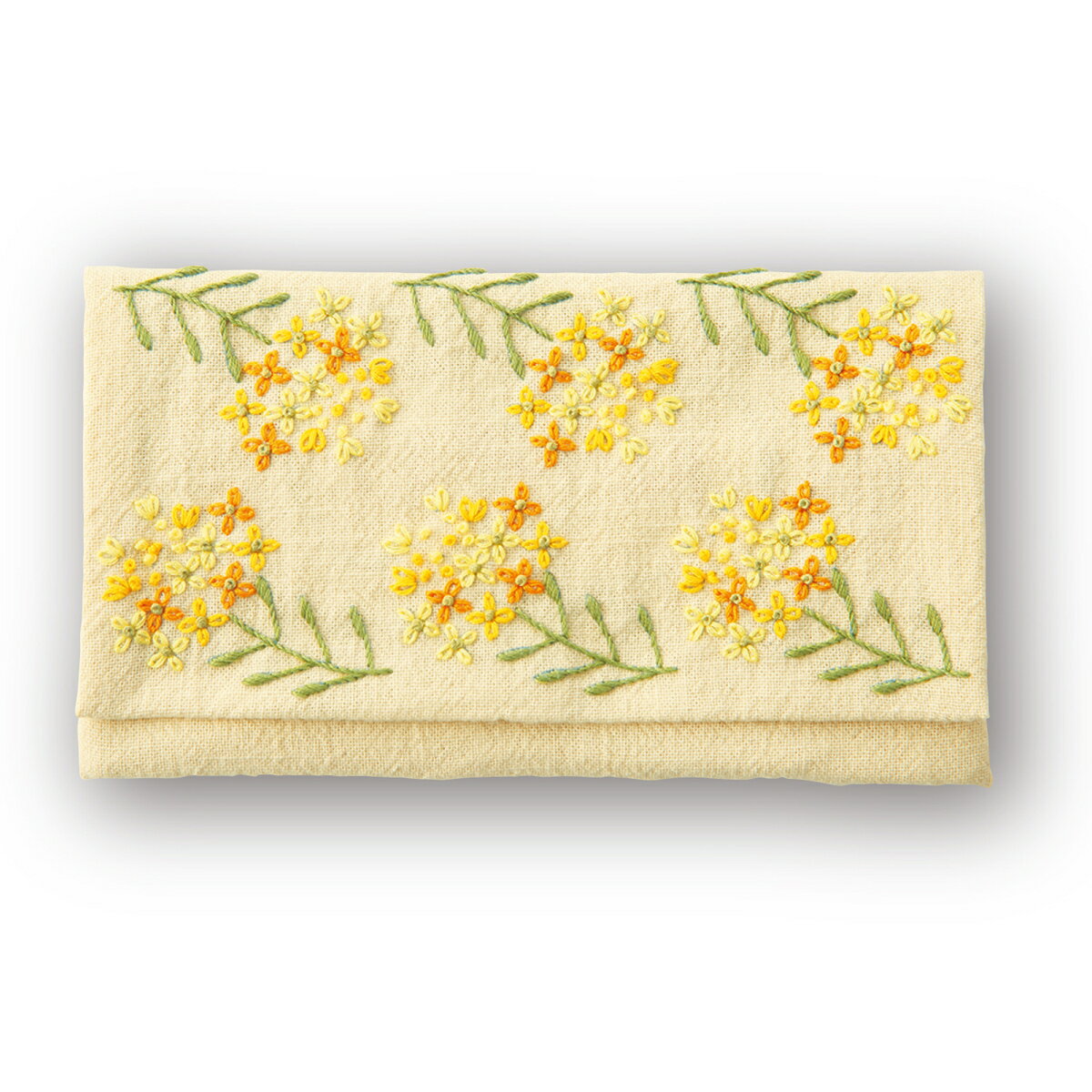 可愛い菜の花柄ポーチの、フランス刺繍キットはいかがでしょうか。カラー図案付説明書で分かりやすく、刺繍布には図案プリント済みですので初めての方も作りやすいです。