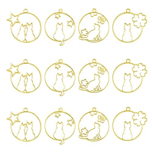 レジンアクセサリー作りでかかせない、レジン枠のセットです。ゴールドの枠の中に猫がいるデザインで4種類のデザインが各3個ずつ、合計12個がセットになっています。ビーズやストーンを散りばめたりしてペンダントやキーホルダー、バックチャームなど作りにぴったりの空枠です。
