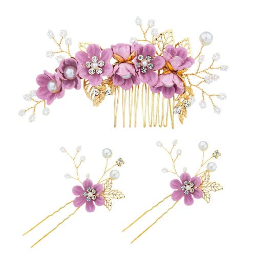 結婚式やパーティーなどフォーマルなシーンで使用できるコーム、ヘアピン、かんざしの3点セットです。ハンドメイドらしい暖かさを感じる花のヘッドドレスで、布で作られた花にパールをあしらった可愛らしく華やかな髪飾りです。和装、洋装のどちらでも使用できるデザインで、Uピン式のため、簡単に髪にとめることができます。色はパープルとブルーの2色があり好みに応じて選ぶことができます。