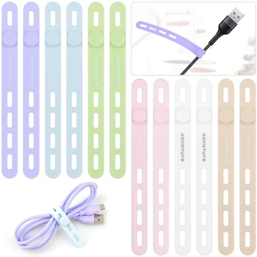 SONATUREの結束ケーブルバンドをおすすめ。柔らかいシリコン素材の全6色のパステル調のカラーが可愛い、ソフトタッチで、通常の結束バンドの様に使い捨てでない、 繰り返し使用可能な環境にやさしいスマホやイヤホンなどのコードをまとめるのに便利な繰り返し使えるケーブルバンドをおすすめです。