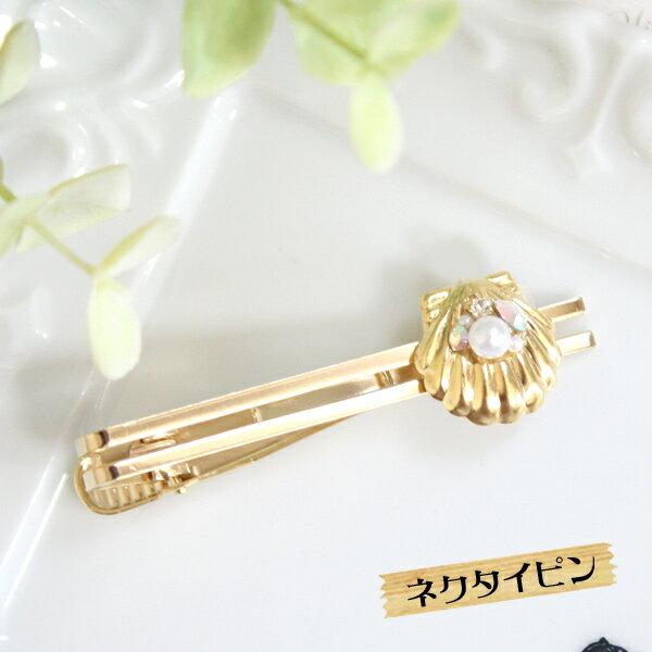ゴールドのネクタイピンの先端には、貝殻と真珠をモチーフにしたビジューがついています。シンプルですが女性らしい可愛らしさを感じられるアイテムですね。