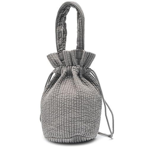わりと何にでも合いそうなヌビ素材の巾着バッグ。色は、写真のグレーのほかに、ブラックとベージュがあります。