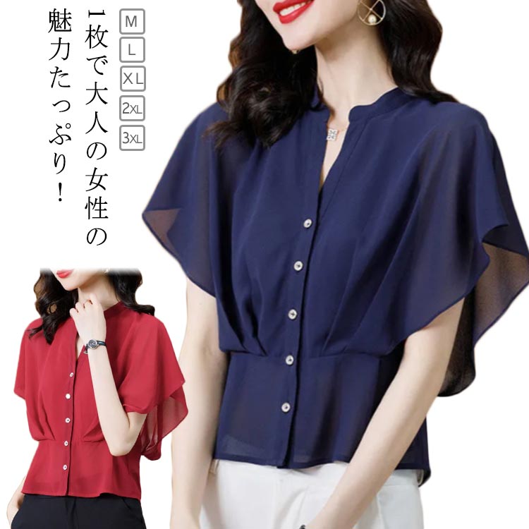 ドルマンフリル袖なので上半身にボリュームがあり鎖骨が目立たず首が短めな骨スト体系を上手くカバーができるペプラム半袖シャツはいかがでしょうか?風が吹いたり歩くたびにほどよく揺れる薄手のシフォン素材は涼しげな印象を与え夏らしくおしゃれです。サイズMから3XLと幅広く派手な装飾がない分 ボタンがコーデのアクセントになります。色味が選べて ボトムスはパンツでもスカートでも合わせやすいです