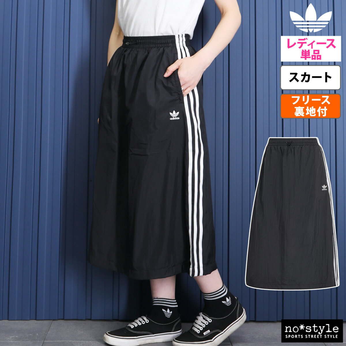 スポーツミックスや注目のブロークコアファッションに最適なアディダスのトレフォイルロゴと3本ラインが印象的な裏フリースのロングスカートです。