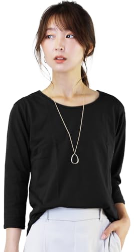 こちら七分袖の無地カットソーです。襟デザインはUネックVネックの普通・深いものが選べますし、サイズもSから3Lまで揃うし、カラーもいろいろあるので、自分にちょうどよいものが見つかると思いますよ。着ると痩せて見えるシルエットになっているところもうれしいですね。ボトムによって普段も着られるシンプルなデザインがいいですね。