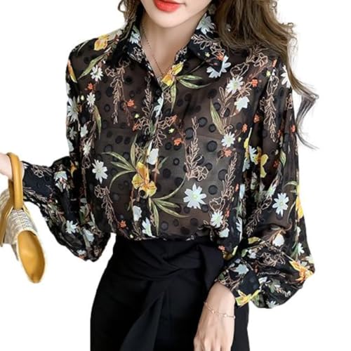 透けるので、1枚で着るのはかなり勇気がいるかとは思いますが、こちらのシアーなシフォン素材に花柄プリントとドット柄のプリントが入ったブラウスはいかがでしょう。パフスリーブのボリューム感もいい感じです。インナーにシンプルな無地のキャミソールを合わせただけでも華やかに見えます。