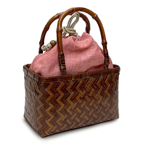 こちらはいかがでしょうか。ブラウンの濃淡で模様が浮き出たバッグは和洋どちらにも合うデザイン。麻生地の巾着(裏地付き)は別仕立てなので、かごバッグとセットでもそれぞれ単独でも使えます。バッグ本体のサイズはおよそ21×12×14cm、持ち手を含む高さは約27cmです。