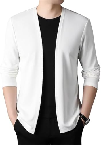 メンズ用の薄手のカーディガンです。軽くて羽織りやすく、清潔感があります。ノーカラーのボタンなし。オフィスの冷房対策にぴったりですよ。