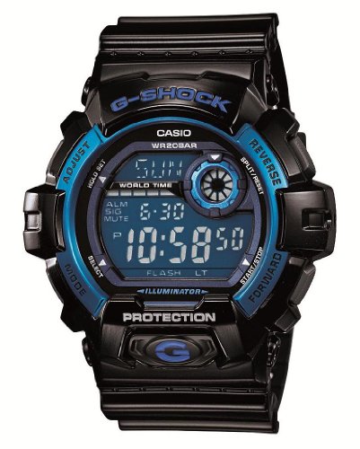 ブラックのGショックです。アクセントにメタリックブルーが使われています。デジタル表示もかっこいいですね。