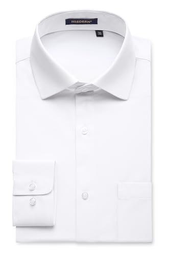 こちらHISDERNのホワイト色のワイシャツはどうでしょうか。首回り45㎝のワイドカラータイプなのでがっしり体型や肩幅の広い人にも似合いやすく、ストレッチ性があって動きやすいし、速乾性に優れ、形態安定でシワになりにくくお手入れが楽で助かるノーアイロンな作りをしていてお薦めです。