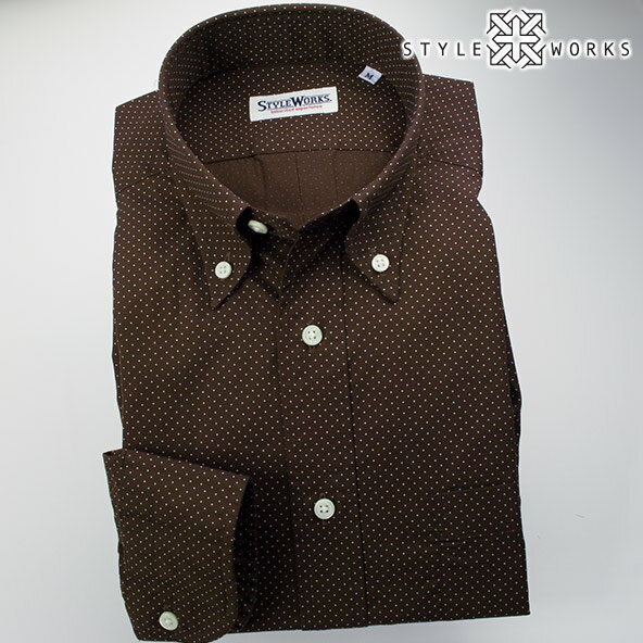 スタイルワークスのドレスシャツです。画像では無地に見えますが、ブラウンの地にホワイトで細かいドットが入っています。カジュアルな雰囲気のドット柄も、サイズの小さいドットだと上品に着こなせるのでオフィスカジュアルにおすすめ。スリムなシルエットですが、背中にボックスプリーツが入り、腕周りも動かしやすく窮屈感のないパターンで作られているので、快適な着心地です。