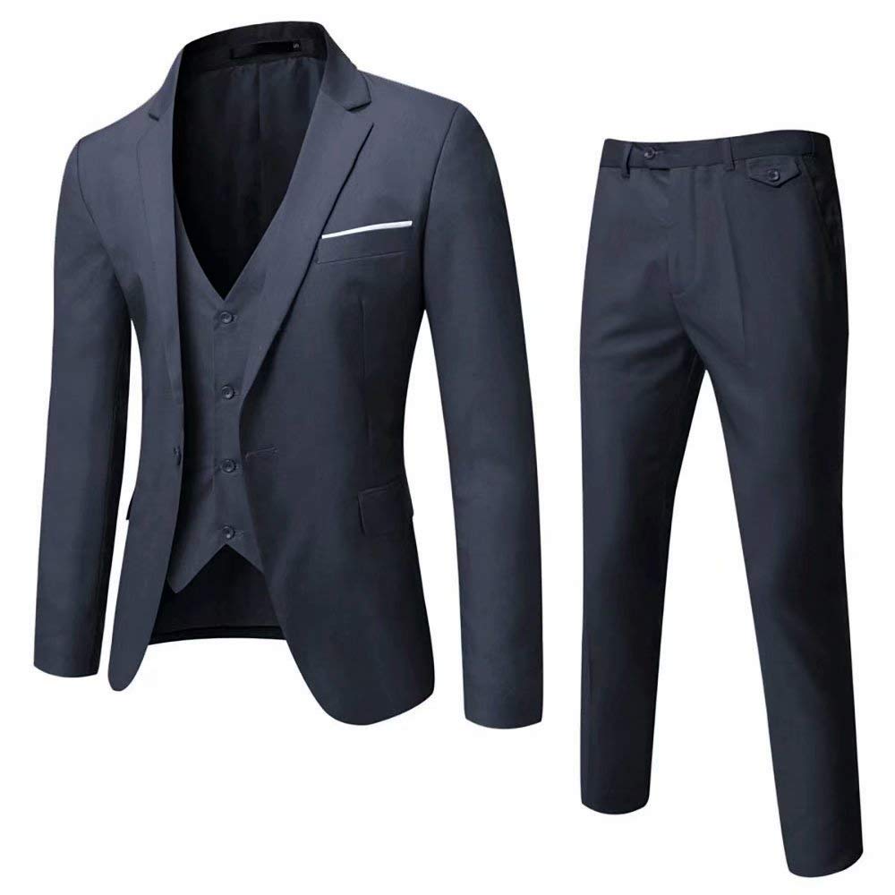 ジャケット、ベスト、パンツがついたこちらの3点スーツをお勧めします。やや光沢のある素材はドレスコードのあるパーティなどにスマートカジュアルとして使えます。