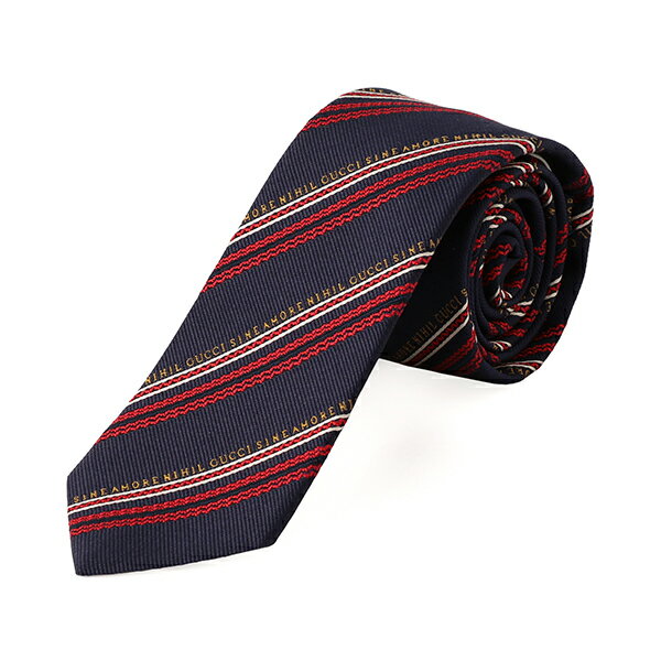 グッチのシルクネクタイはいかが。 ウェービーラインのストライプに英字が施され、落ち着いたカラーでどんなシャツやジャケットにも合わせやすいです。