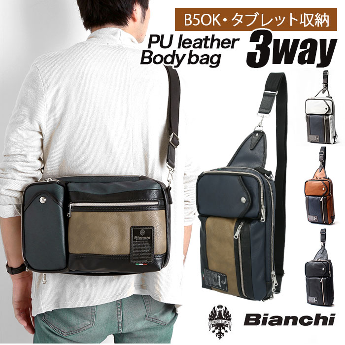 ビアンキの3wayボディバッグはいかがでしょう。ショルダーストラップのつけ外しで、クラッチ・横型ショルダー・縦型ボディバッグの3wayで使え、斜め掛けもできるのでシーンに応じた使い分けができます。500mlペットボトルや折りたたみ傘なども収納できる容量大きめサイズが旅行用に便利だと思います。