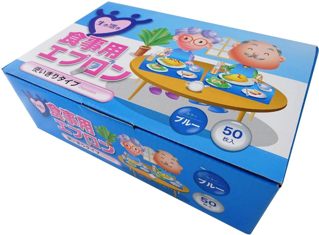 50枚入りの介護用食事の使い捨てのエプロンです。ビニール袋の様な素材でエンポス加工が施されて肌触りが良く、首後ろが粘着テープ仕様で簡単装着なので、オススメです。