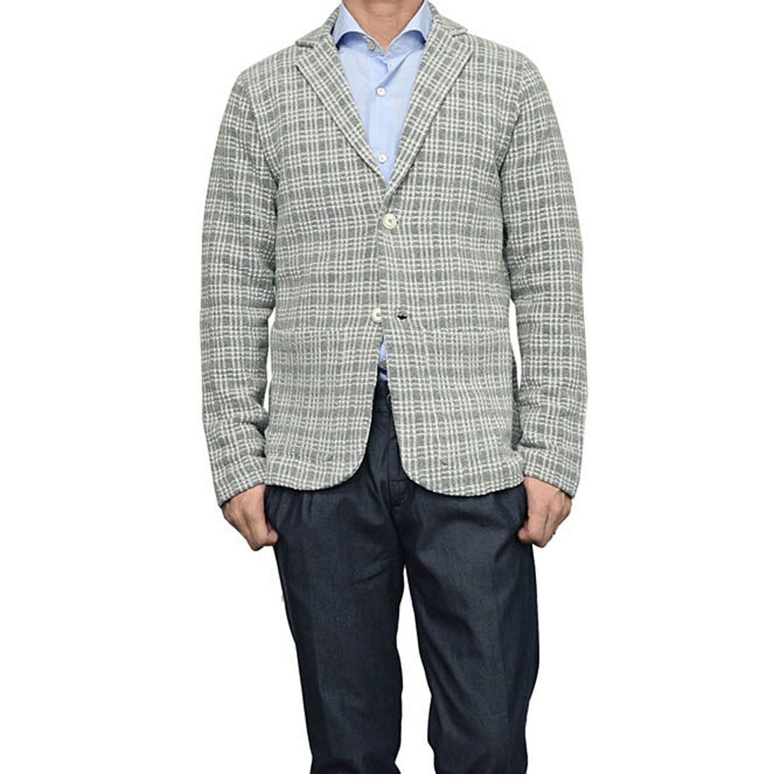 コットン、ナイロン素材でさらっとした肌触りのニットジャケットです。チェック柄が爽やかな印象でとても気に入っています。ニットなので伸縮性もバッチリです。