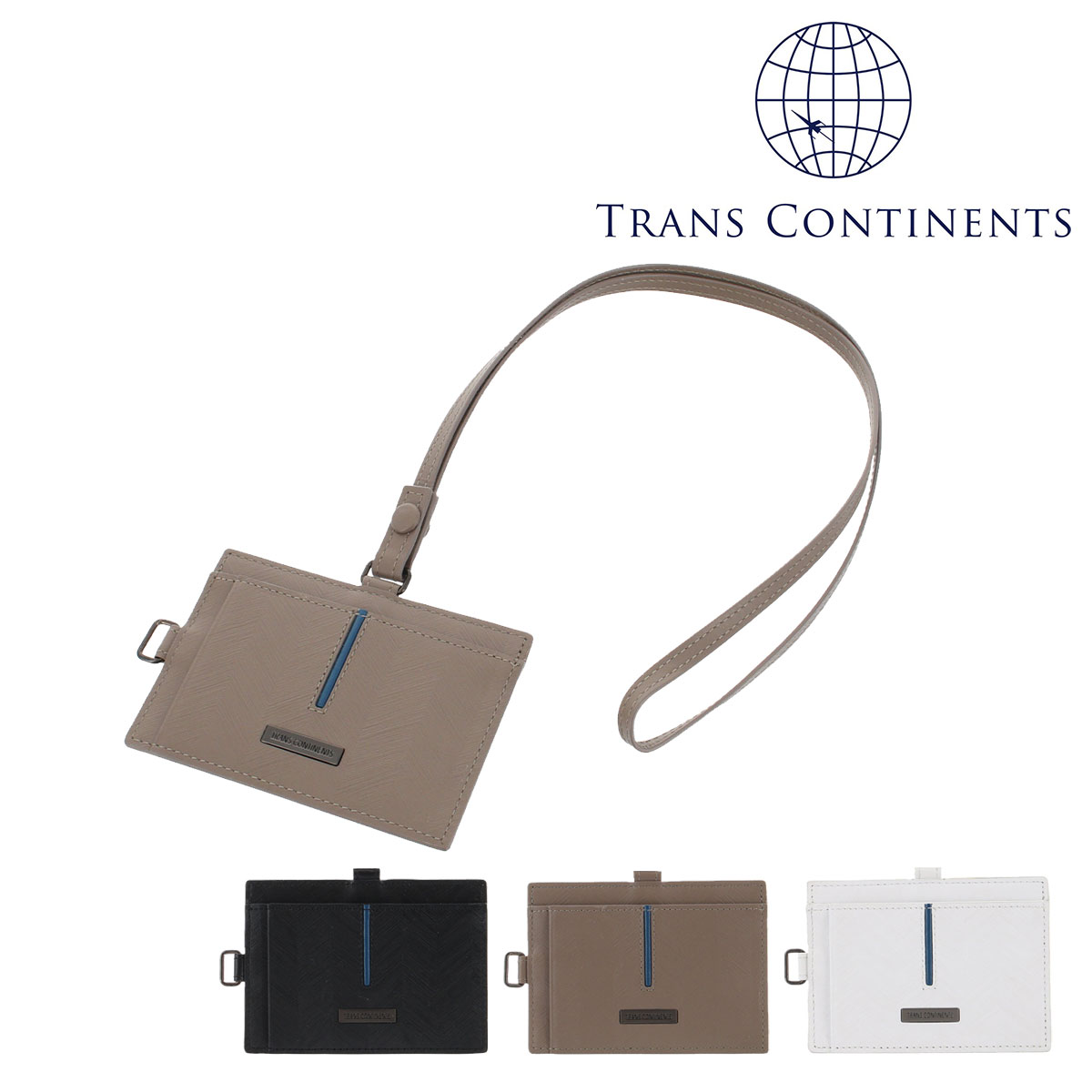 日本のブランドであり、旅をライフスタイルに取り入れている方などのオンオフのファッションアイテムを展開している、トランスコンチネンツのパスケースはいかがでしょう。ストラップ用のホールが縦横どちらにも付いていてお勧めです。