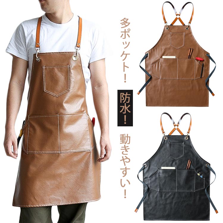 カラーが2色のPUレザーのエプロンです。防水性や撥水性が良く汚れにくく、多ポケットで使い易く、動き易いので、オススメです。