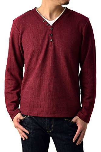 Tシャツ カットソー ヘンリーネック 半袖 重ね着風 レイヤード ワッフル生地 トップス メンズ ホワイト ミックスグレー ミックスネイビー ミックスブラック ミックスワイン