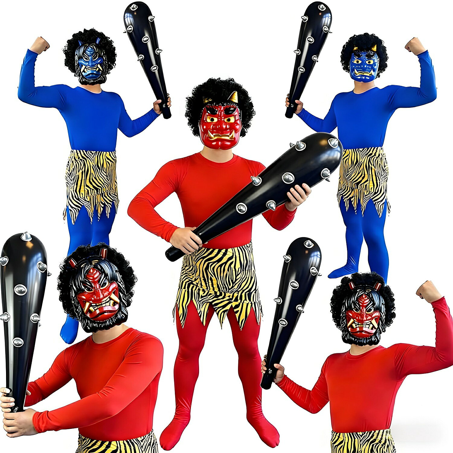 鬼のコスプレ衣装です。全身タイツに桂とお面、こん棒までついているのでこれ一つで完全に変身できて便利ですよ。